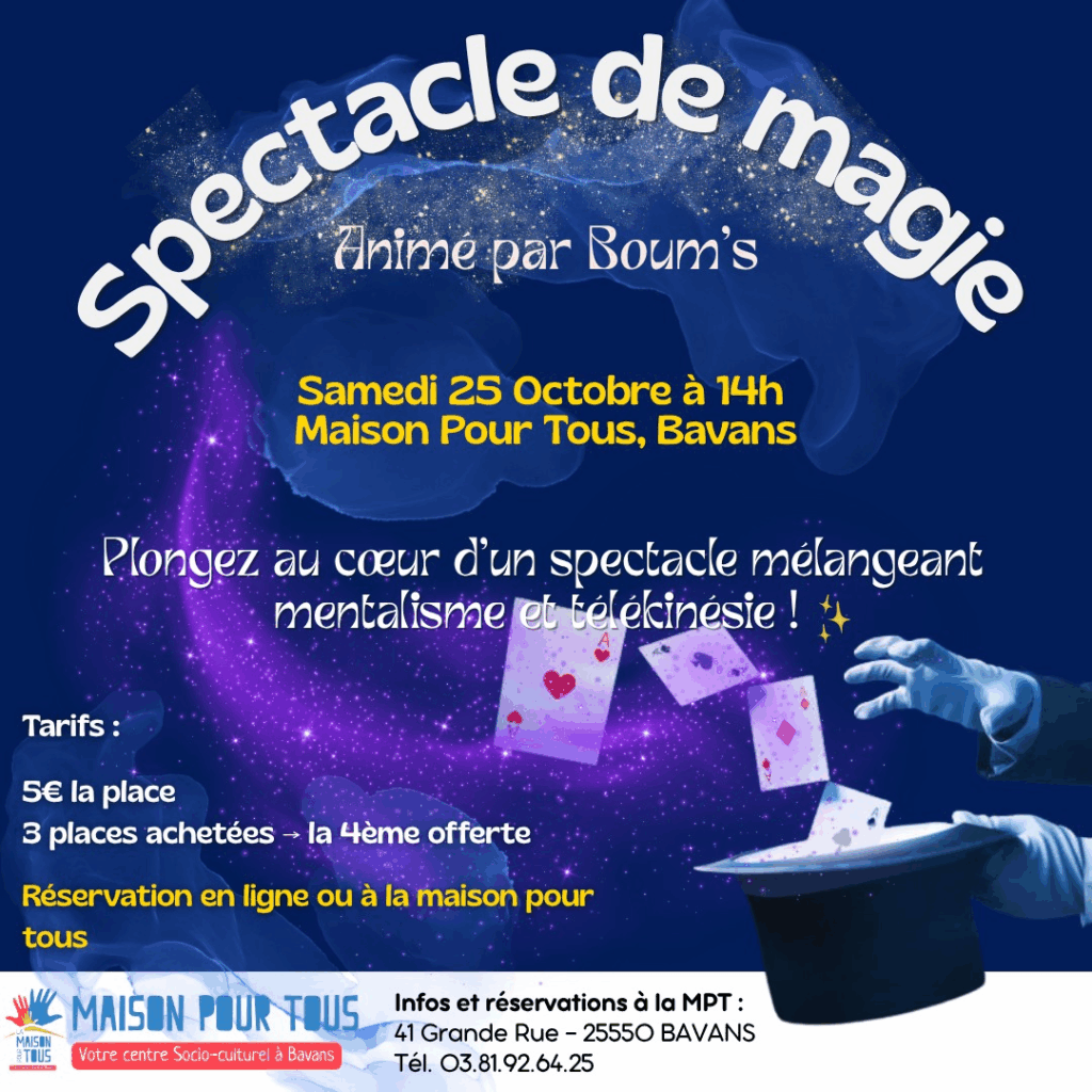 Prendre votre billet : https://www.helloasso.com/associations/agasc-bavans-centre-social-maison-pour-tous/evenements/spectacle-de-magie-avec-boums-1